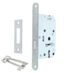 Dit kastslot heeft een doornmaat van 50 mm. Dit is de afstand van het hart van het deurklinkgat tot de voorkant van de voorplaat van het slot. Het kastslot wordt geleverd inclusief rechthoekige sluitplaat en 2 sleutels. De afgeronde voorplaat is rvs. De maten van deze voorplaat zijn 174 x 20 mm.