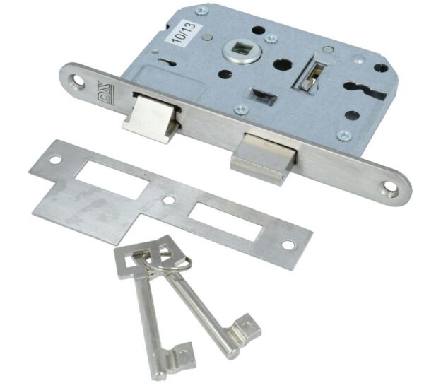 Dit dag en nacht insteekslot heeft een doornmaat van 50 mm. Dit is de afstand van het hart van het sleutelgat tot de voorkant van de voorplaat van het slot. De maat van het hart van het sleutelgat tot het hart van het krukgat is 56 mm. Het dag en nachtslot wordt geleverd inclusief 2 sleutels en een rechthoekige sluitplaat. De afgeronde voorplaat is rvs. De maten van deze plaat zijn 174 x 20 mm.