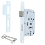 Dit dag en nacht insteekslot heeft een doornmaat van 50 mm. Dit is de afstand van het hart van het sleutelgat tot de voorkant van de voorplaat van het slot. De maat van het hart van het sleutelgat tot het hart van het krukgat is 56 mm. Het dag en nachtslot wordt geleverd inclusief 2 sleutels en een rechthoekige sluitplaat. De afgeronde voorplaat is wit gelakt. De maten van deze plaat zijn 174 x 20 mm.
