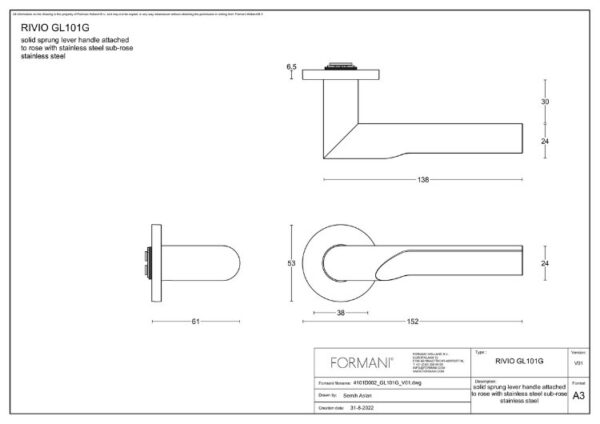 Deze enkele deurklink is van FORMANI uit de serie RIVIO. Deze is ontworpen door Product Design Consultant Gensler. Deze massieve deurklink is geveerd op rozet. Dit betekend dat de veer in het slot wordt ontzien en de klink weer in positie brengt.