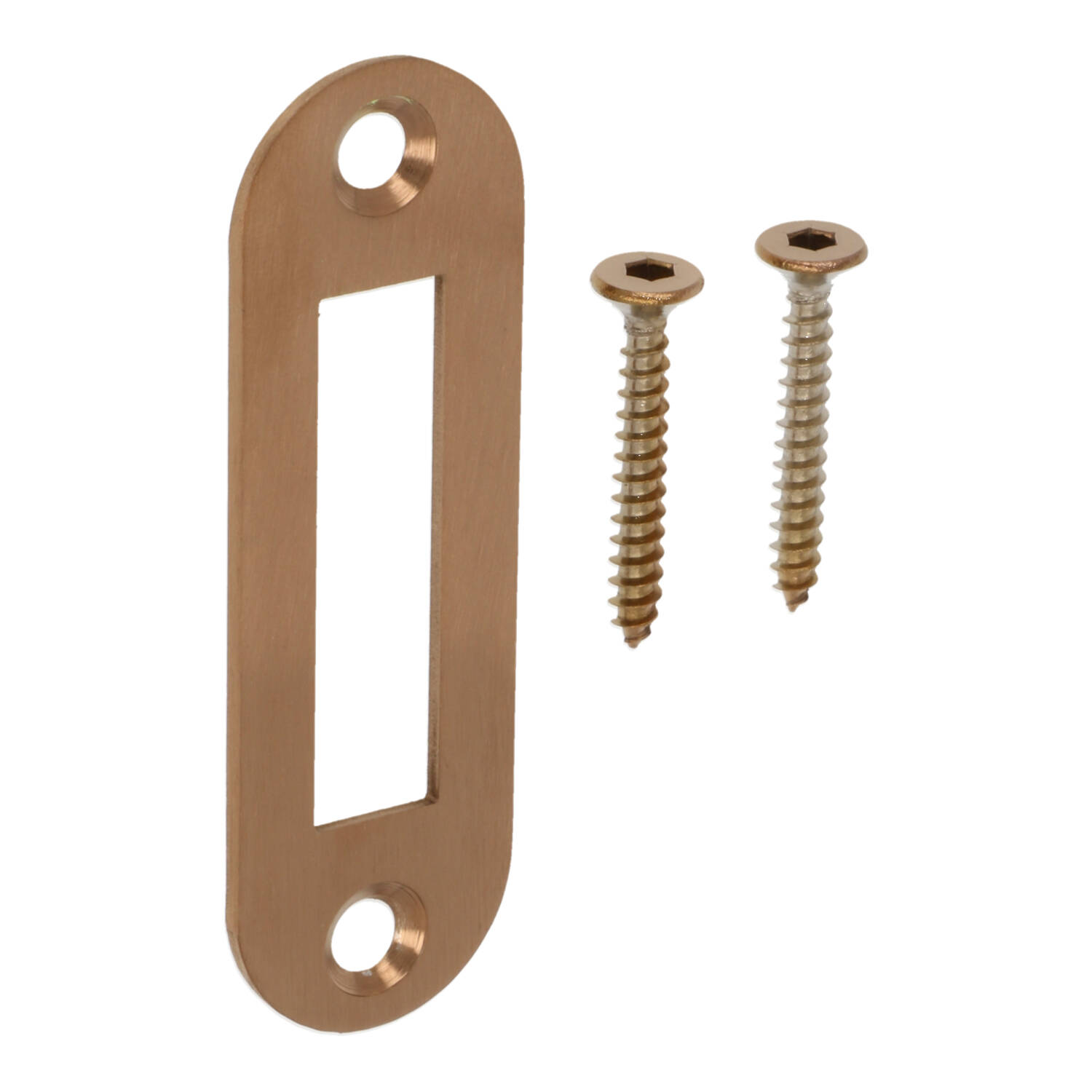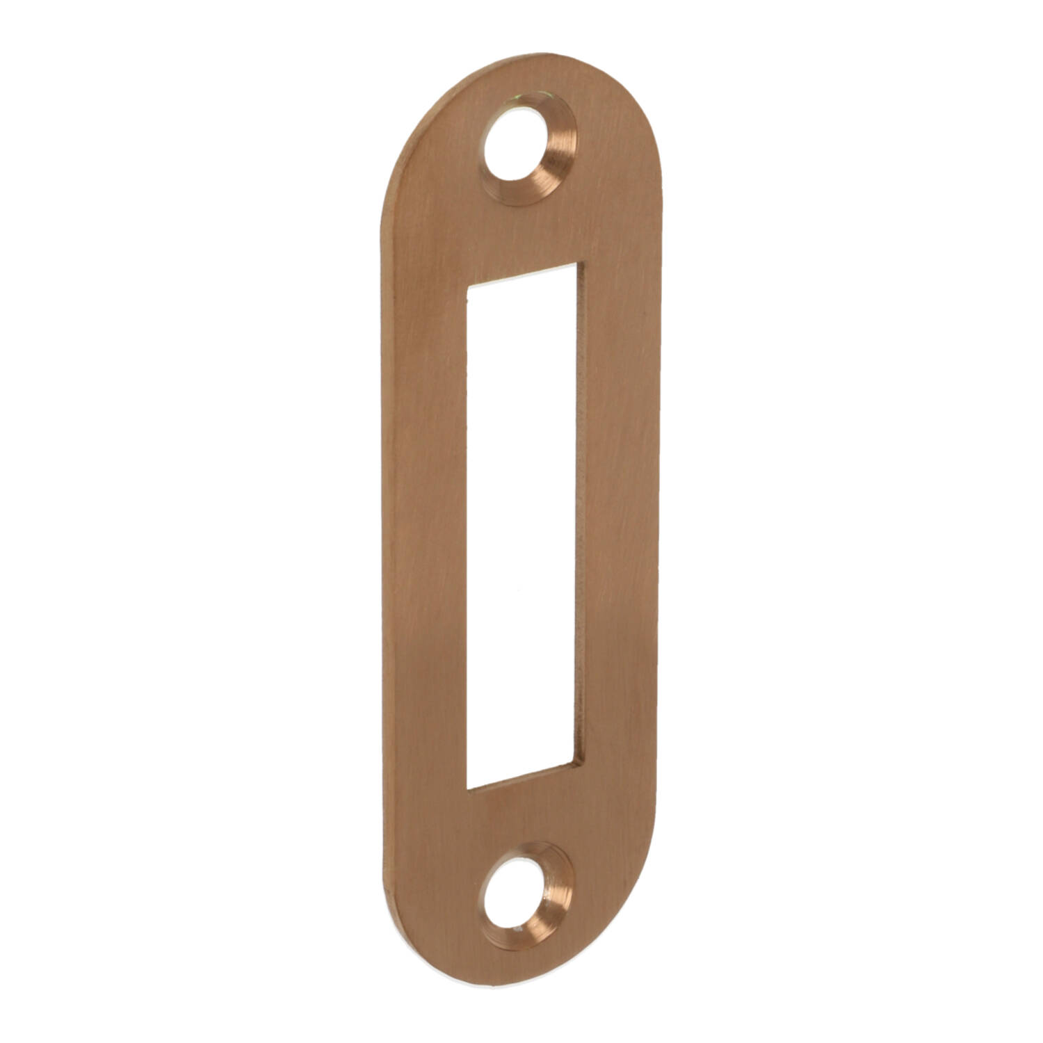 Afgeronde sluitplaat PVD mat brons voor de kastsloten van FORMANI. Deze sluitplaat komt uit de serie BASICS van Formani. De sluitplaat heeft dezelfde finish als al het deurbeslag van FORMANI in de finish PVD mat brons! Deze sluitplaat wordt standaard geleverd inclusief houtschroeven in dezelfde finish.