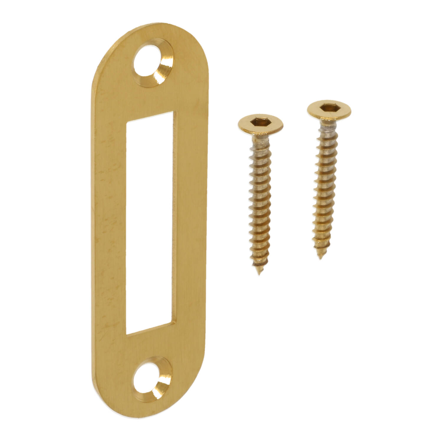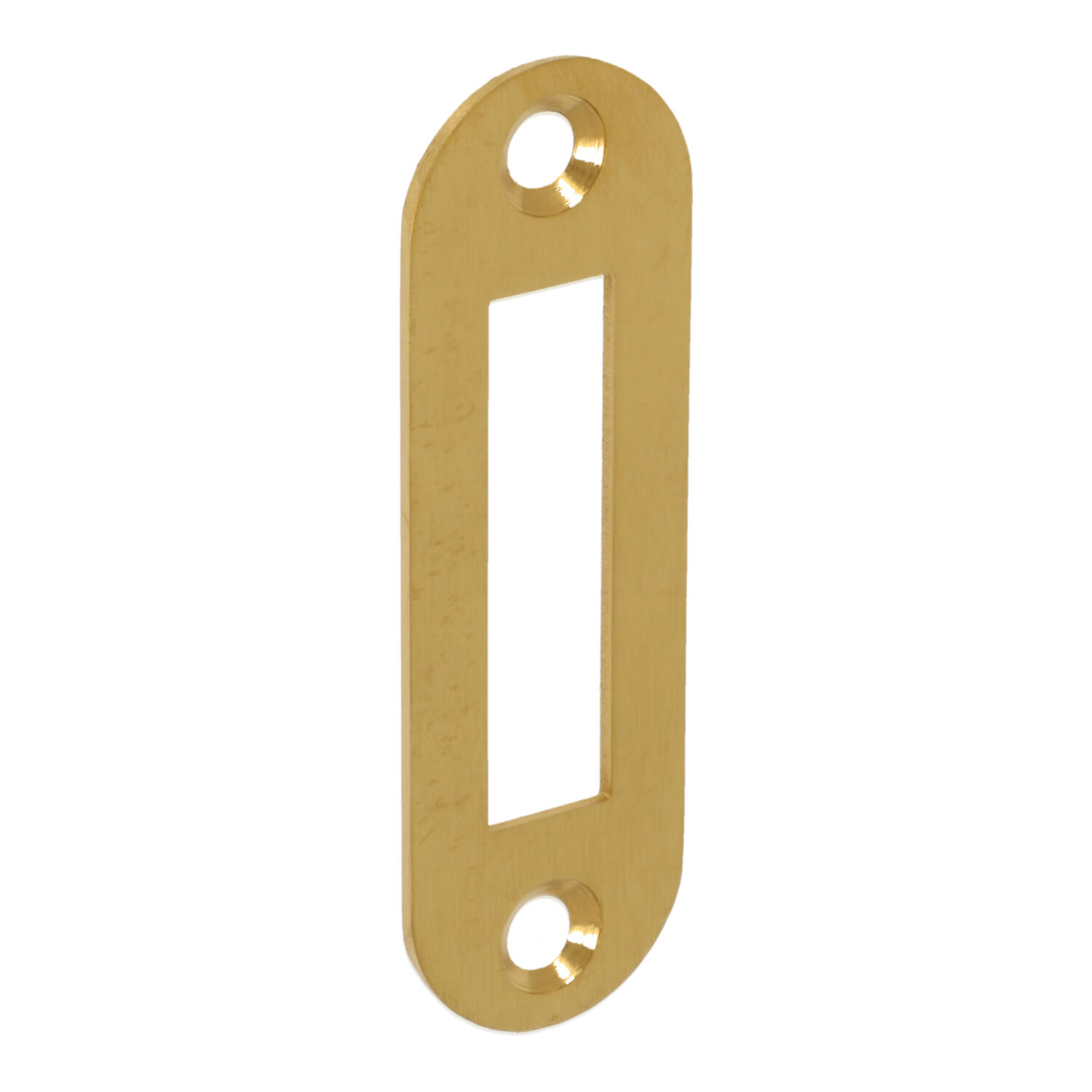 Afgeronde sluitplaat PVD mat goud voor de kastsloten van FORMANI. Deze sluitplaat komt uit de serie BASICS van Formani. De sluitplaat heeft dezelfde finish als al het deurbeslag van FORMANI in de finish PVD mat goud! Deze sluitplaat wordt standaard geleverd inclusief houtschroeven in dezelfde finish.