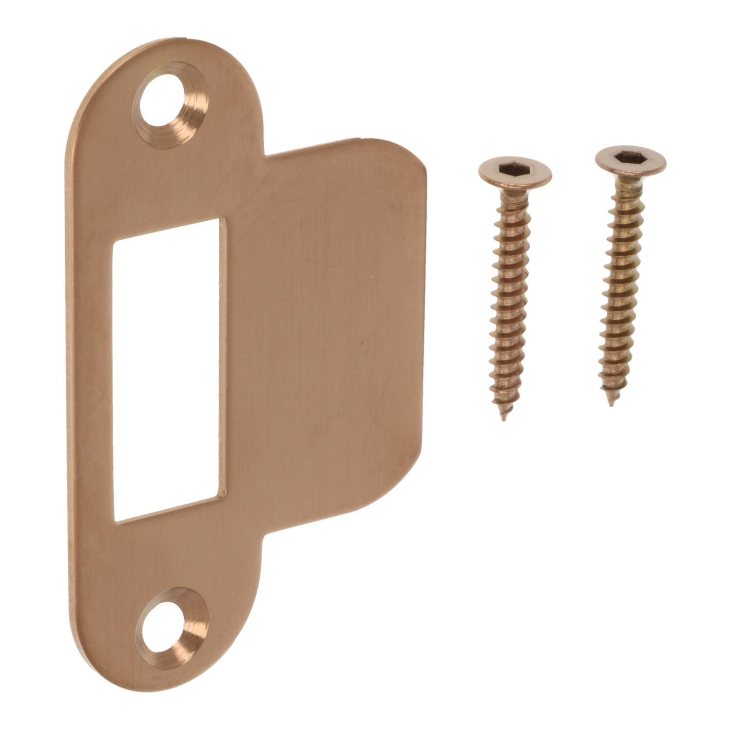 Afgeronde sluitplaat PVD licht brons voor de loopsloten van FORMANI. Deze sluitplaat komt uit de serie BASICS van Formani. De sluitplaat heeft dezelfde finish als al het deurbeslag van FORMANI in de finish PVD licht brons! Deze sluitplaat wordt standaard geleverd inclusief houtschroeven in dezelfde finish.