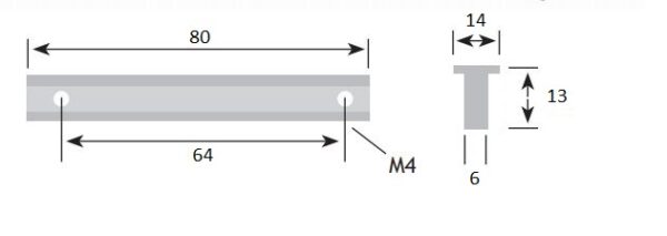 De h.o.h. maat van de schroefgaten is 64 mm. De totale lengte van de greep is 80 mm. De hoogte van de greep is 13 mm. Materiaal is aluminium geanodiseerd.
