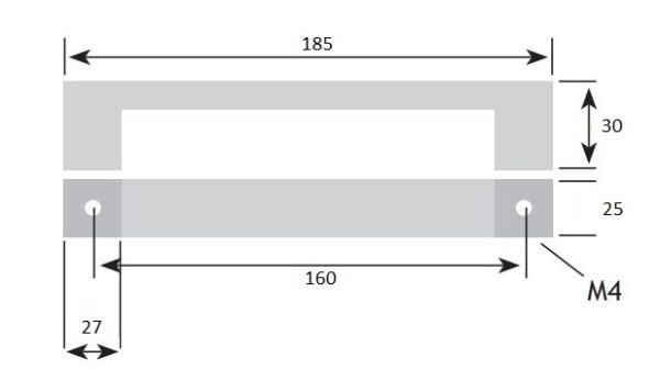 De h.o.h. maat van de schroefgaten 160 mm. De totale lengte van de greep is 185 mm. De hoogte van de greep is 29 mm. De voet is 27 x 25 mm.