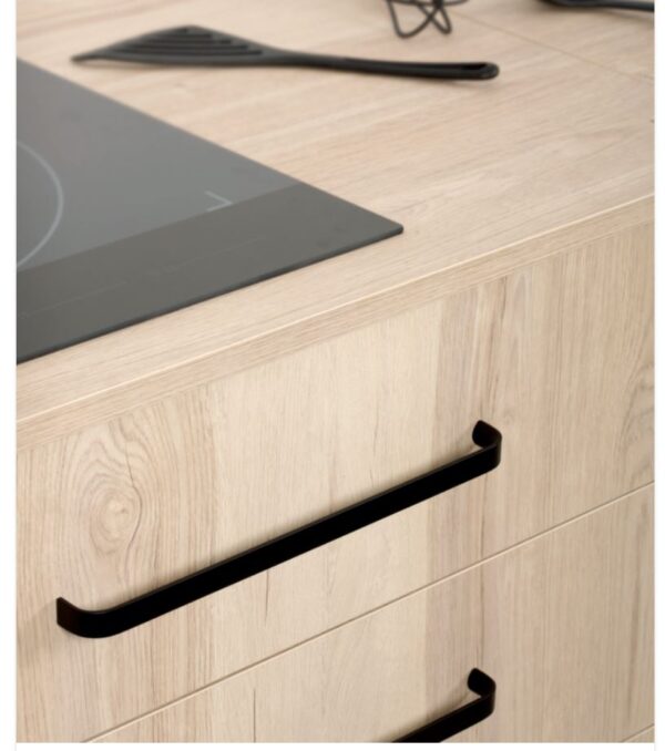 De h.o.h. maat van de schroefgaten 256 mm. De totale lengte van de greep is 263 mm. De greep komt 30 mm naar voren en is 17 mm breed.