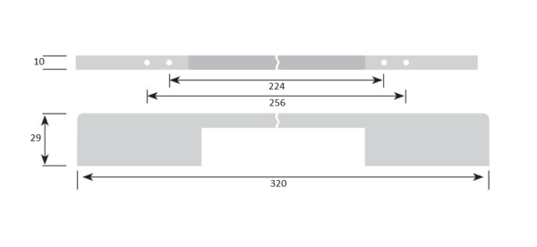 De h.o.h. maat van de schroefgaten is zowel 224 als 256 mm. De totale lengte van de greep is 320 mm. De hoogte van de greep is 29 mm. De dikte is 10 mm.