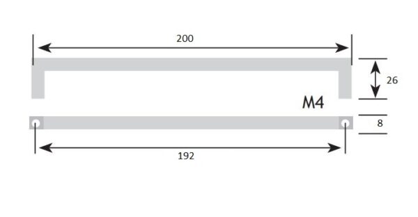 De h.o.h. maat van de schroefgaten 192 mm. De hoogte van de greep is 28 mm. De totale lengte is 200 mm. De dikte is 9 mm.