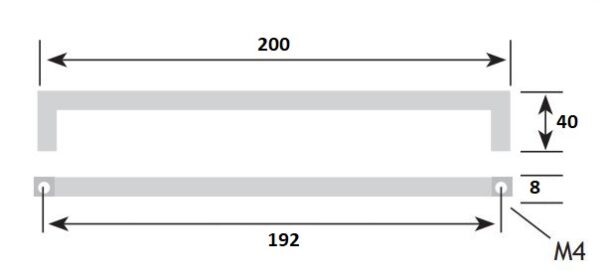 De h.o.h. maat van de schroefgaten is 192 mm. De totale lengte van de greep is 200 mm. De hoogte van de greep is 27 mm. De greep is vierkant 8×8 mm. Materiaal rvs-Look.