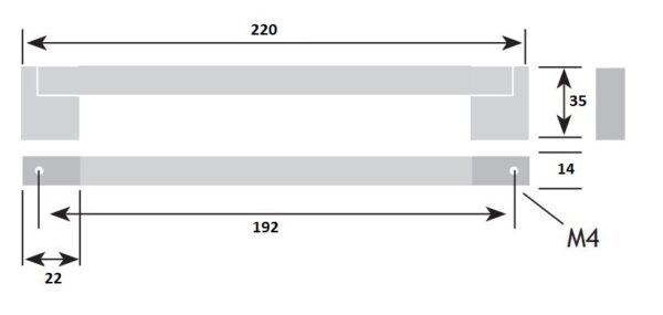 De h.o.h. maat van de schroefgaten is 192 mm. De totale lengte van de greep is 220 mm. De hoogte van de greep is 35 mm. De greep is rond 14 mm en 22 mm breed.