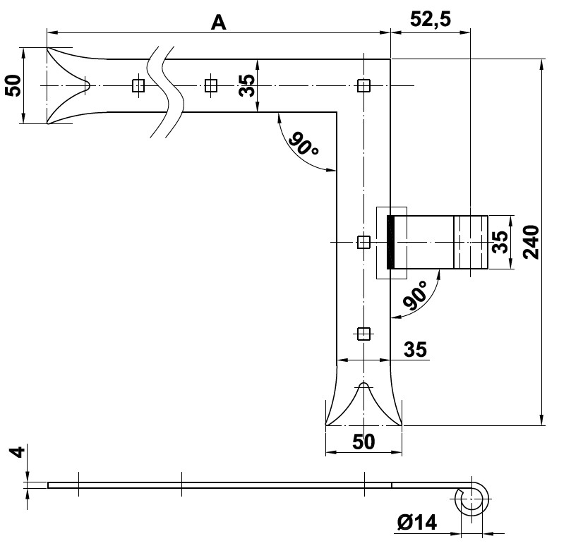 Hoekheng links 40 cm visstaart voor draaipen 14 mm staal zwart
