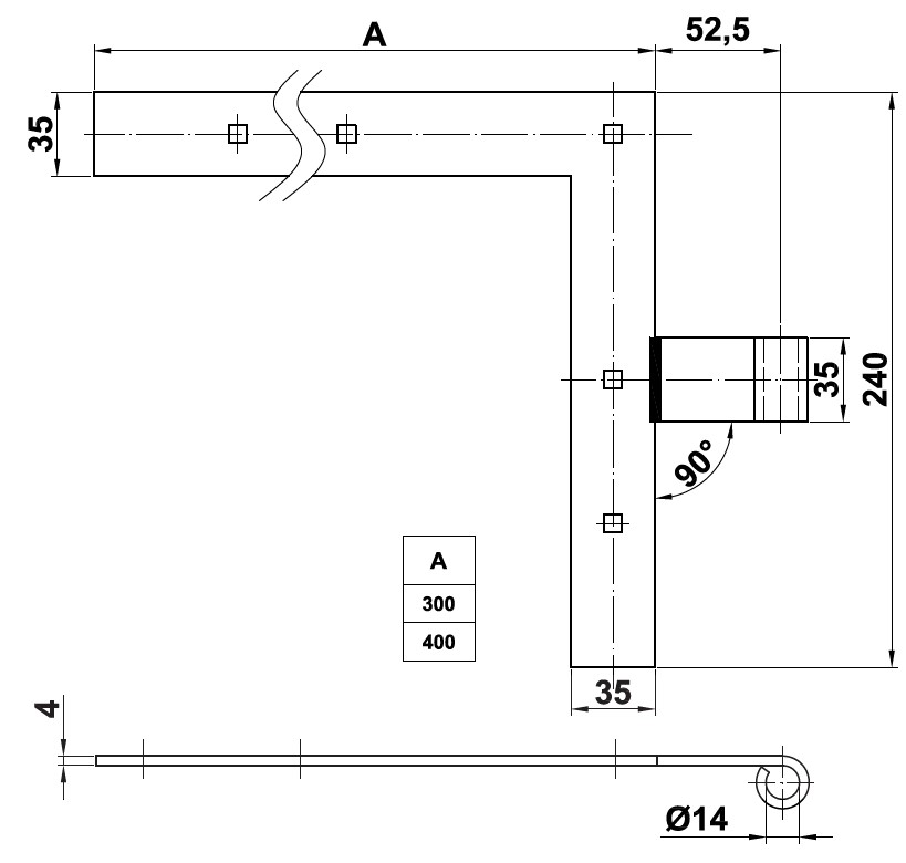 Hoekheng rechts 30 cm recht voor draaipen 14 mm staal zwart