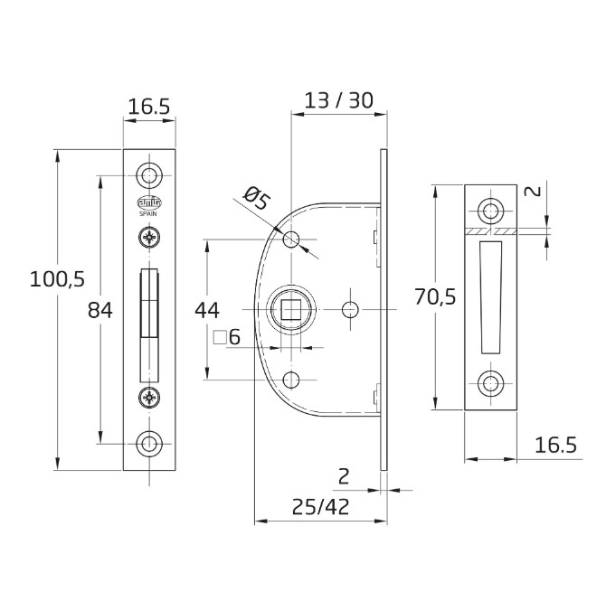 Met 6 mm krukgat, doornmaat 30 mm. Stalen kast met zwarte voorplaat en rechthoekige sluitplaat 70 x 16 mm.
