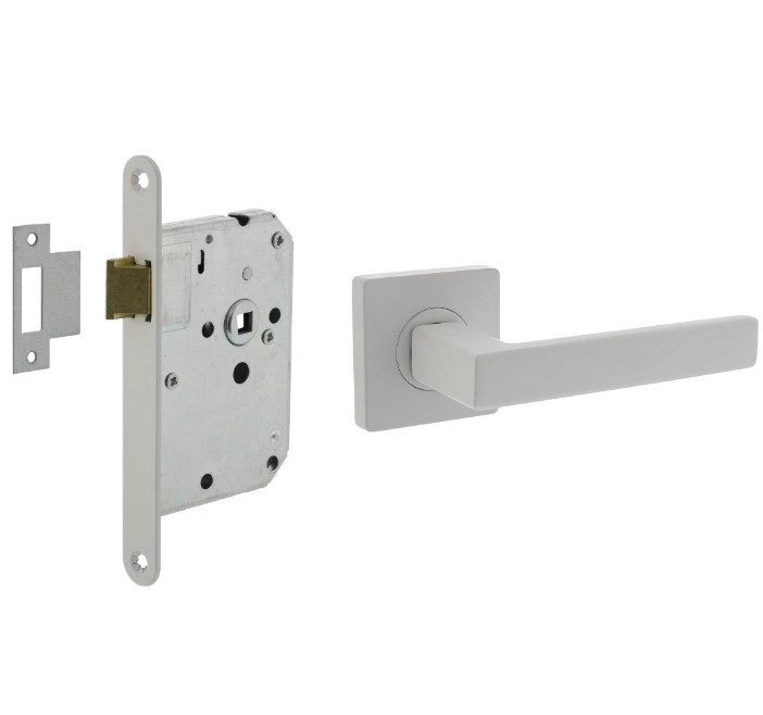 Deze deurbeslag set voor binnendeuren bestaat uit een loopslot met een bijpassende deurklink. Het loopslot heeft een doornmaat van 50 mm en wordt geleverd inclusief sluitplaat en een wit afgeronde voorplaat. voor het slot kunt u dezelfde inbouw- en freesmaten gebruiken als een standaard woningslot. De dagschoot van dit slot is omwisselbaar. Dat wil zeggen dat deze voor zowel naar linksdraaiende als rechtsdraaiende deuren geschikt is. Deurklink Hera op vierkant rozet is uitgevoerd in zamak en is naderhand van een witte coating voorzien. De rozet heeft een afmeting van 55x55x10 mm en is voorzien van nokken, waardoor de kruk beter op zijn plek wordt gehouden. Deze deurklink is geschikt voor een deurdikte van 38 – 42 mm en wordt per paar geleverd inclusief bevestigingsmateriaal.
