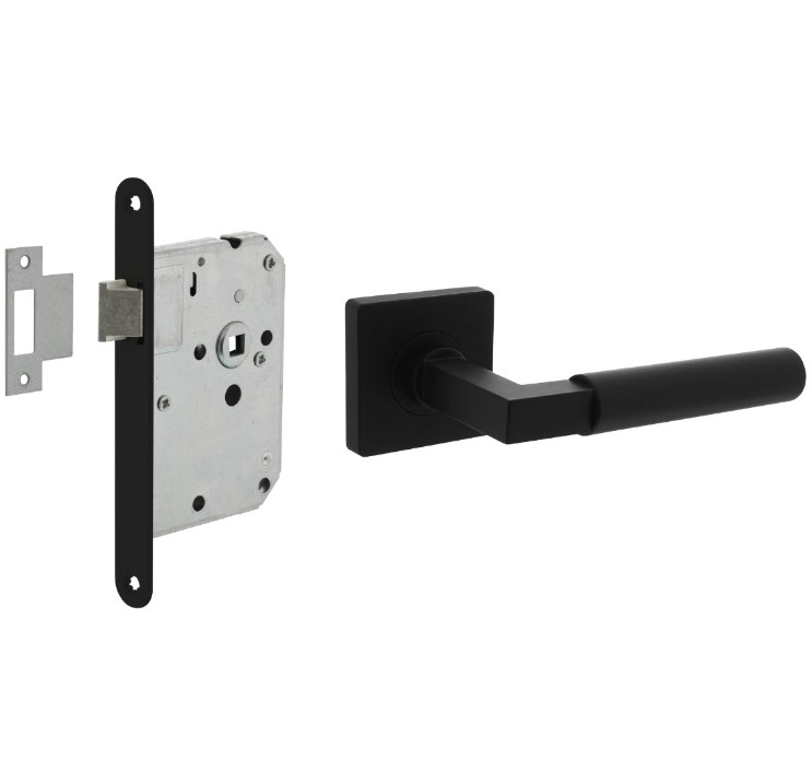 Deze deurbeslag set voor binnendeuren bestaat uit een loopslot met een bijpassende deurklink. Het loopslot heeft een doornmaat van 50 mm en wordt geleverd inclusief sluitplaat en een zwarte afgeronde voorplaat. voor het slot kunt u dezelfde inbouw- en freesmaten gebruiken als een standaard woningslot. De dagschoot van dit slot is omwisselbaar. Dat wil zeggen dat deze voor zowel naar linksdraaiende als rechtsdraaiende deuren geschikt is. Deurklink Bau-stil op vierkant rozet is uitgevoerd in zamak en is naderhand van een mat zwarte coating voorzien. De rozet heeft een afmeting van 55x55x10 mm en is voorzien van nokken, waardoor de kruk beter op zijn plek wordt gehouden. Deze deurklink is geschikt voor een deurdikte van 38 – 42 mm en wordt per paar geleverd inclusief bevestigingsmateriaal.