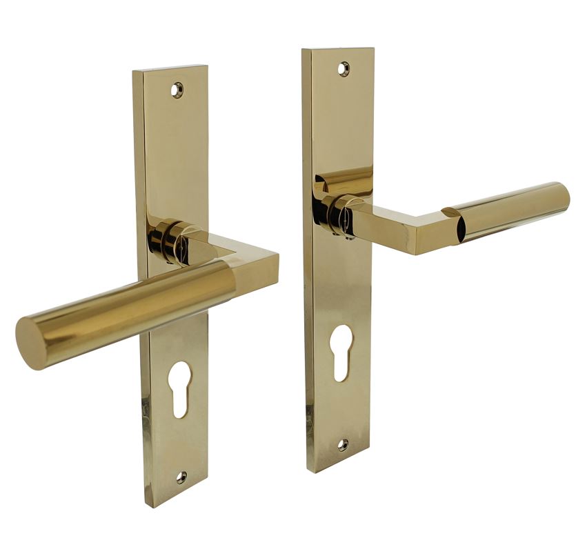 Deurklink Bau-Stil is uitgevoerd in zamak en voorzien van een hoogwaardige messingkleurige PVD coating, waardoor hij een glanzende gouden uitstraling krijgt. Het design vloeit voort uit designstromingen uit de dertiger jaren, die gekenmerkt werd door Bauhaus en Jugendstil. Deze deurklink op rechthoekig schild is voorzien van een profielcilindergat maat 72Â mm. Het voordeel van deurklinken op schild is dat ze vaak gaten afdekken die zijn achtergelaten door het vorige deurbeslag. Daarnaast is het schild geveerd zodat de deurklink na gebruik weer terugveert naar zijn horizontale positie. Dit product wordt per paar geleverd inclusief bevestigingsmateriaal voor montage.