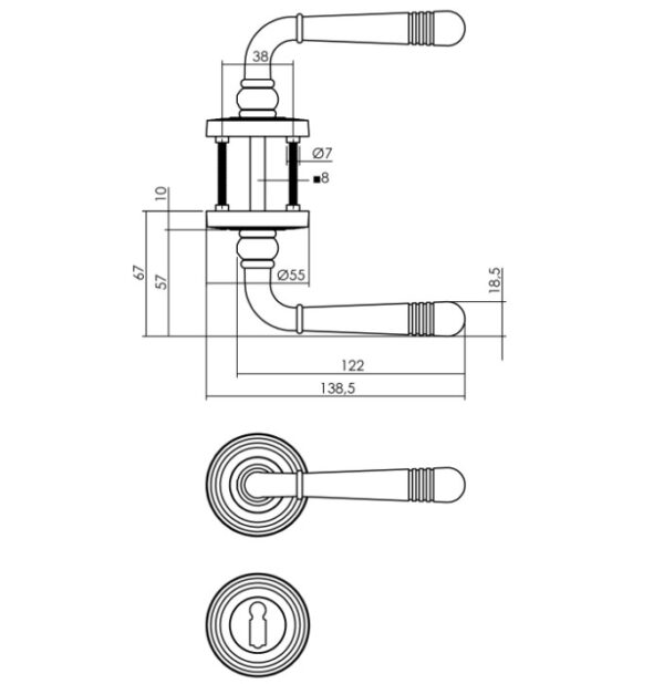 Deurklink Helena, vastdraaibaar met veer op ronde rozet. met rillen Ø54×9 mm. Wordt geleverd inclusief 2 sleutelplaatjes.