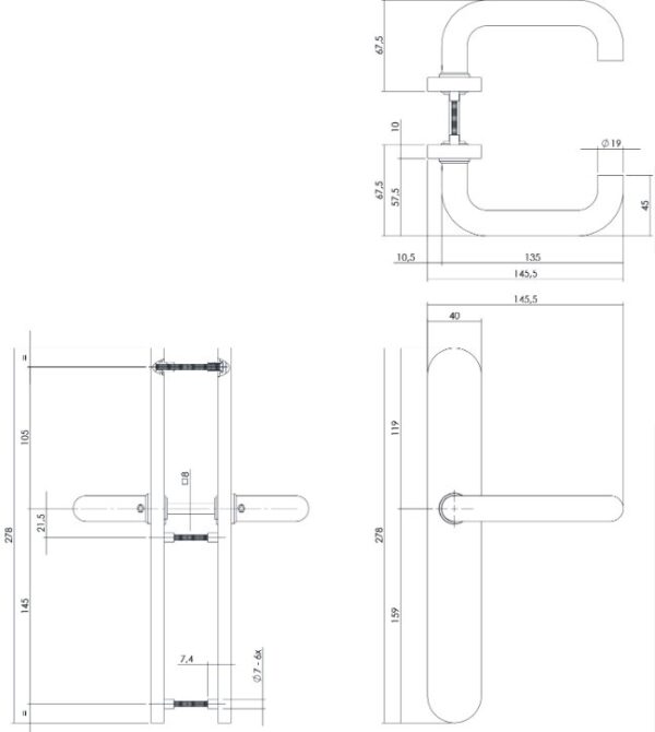 Intersteel deurklink rond Ø19mm op xL schild 278x40mm verdekt blind rvs