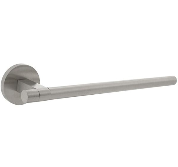 Deurklink Shiraat op ronde rozet is het resultaat van een zoektocht naar minimalisme en eenvoud. Het design van deze deurklink komt van de Amsterdamse Ontwerpstudio Grand&Johnson. Intersteel nam daarna de technische uitvoering voor zijn rekening. Deze succesvolle samenwerking resulteerde in de Red Dot Design Award 2022. Bij het ontwerp stond de vraag centraal, ‘wat betekent minimaal?’ Het resultaat is een exclusieve, slank vormgegeven deurklink, met een lengte van maar liefst 250 mm. Intersteel ontwikkelde speciaal voor deze lijn een nieuw veermechanisme die de zware belasting, veroorzaakt door de lengte van de greep, makkelijk aankan. De deurklink is uitgevoerd in geborsteld roestvast staal en is éénzijdig rechts verdekt. Dit betekent dat alleen de rechter uitvoering een verdekte montage heeft. De andere kant heeft zichtbare schroefgaten. Dit product wordt per paar geleverd inclusief bevestigingsmateriaal voor montage.