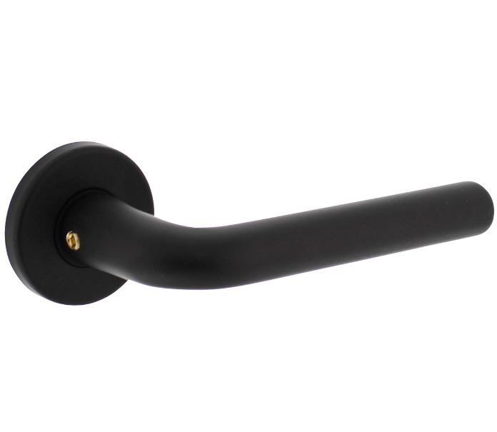 deurklink Derby op ronde rozet is gemaakt van aluminium en uitgevoerd in de trendy kleur mat zwart. De rozet is v…