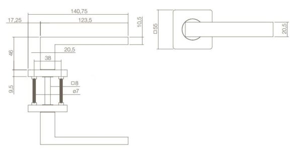 Enkele Deurklink Hera, vastdraaibaar met veer op vierkant rozet. Nokken ø7mm.