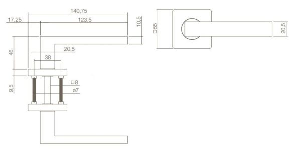 deurklink Hera, vastdraaibaar met veer op vierkant rozet. Nokken ø7mm.