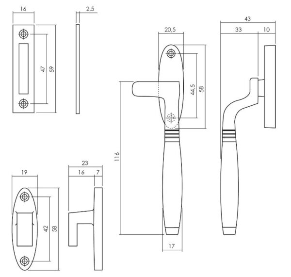 Deze raamsluiting Ton met ebbenhouten greep is uitgevoerd in mat chroom. Deze sluiting in rechter uitvoering wordt geleverd inclusief sluitplaat en sluithaak, zodat u zelf de keuze kunt maken of u de sluiting in of op het kozijn wilt monteren. Deze raamsluiting met schroefgaten wordt per stuk geleved inclusief bevestigingsmateriaal voor montage.