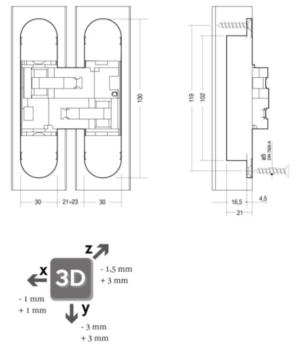 Dit scharnier is 3D verstelbaar. Dat wil zeggen dat u de scharnier verticaal, horizontaal en in de diepte kunt instellen. Hierdoor zorgt u voor een nauwkeurige montage en kunt u ze eenvoudig na stellen wanneer u de deur gaat afhangen. voor deuren van een hoogte van 2115 mm, adviseren wij om drie scharnieren toe te passen en deuren met een hoogte van 2315 mm om vier scharnieren toe te passen. voor deuren met een gewicht tot 80 kg adviseren wij twee scharnieren en tot een gewicht van 120 kg drie scharnieren.