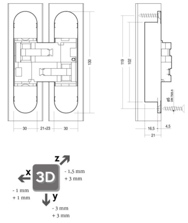 Dit scharnier is 3D verstelbaar. Dat wil zeggen dat u het scharnier verticaal, horizontaal en in de diepte kunt instellen. Hierdoor zorgt u voor een nauwkeurige montage en kunt u ze eenvoudig na stellen wanneer u de deur gaat afhangen. voor deuren van een hoogte van 2115 mm, adviseren wij om drie scharnieren toe te passen en deuren met een hoogte van 2315 mm om vier scharnieren toe te passen. voor deuren met een gewicht tot 50 kg adviseren wij twee scharnieren en tot een gewicht van 70 kg drie scharnieren.