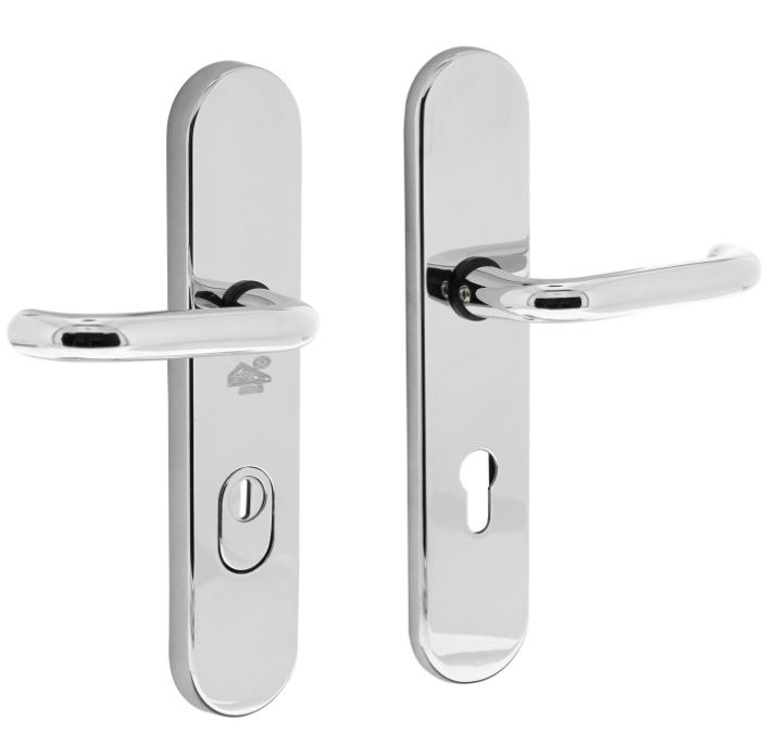 Deze ovale set achterdeurbeslag is uitgevoerd met extra bescherming tegen inbraak en is SKG3 gekeurd. Deze set heeft een profielcilindergat maat van 72 mm en heeft aan beide zijden een passende deurklink. Het veiligheidsbeslag is uitgevoerd in chroom en naderhand gepolijst, waardoor het een glanzende uitstraling heeft. Het veiligheidsbeslag is voorzien van kerntrekbeveiliging, waardoor de cilinder wordt beschermt tegen het uittrekken en uitboren van de cilinderkern. kerntrekbeveiliging is sinds eind 2013 een verplicht in nieuwbouw en sinds april 2014 ook voor bestaande bouw.