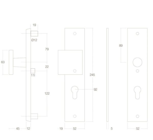 De maten van het deurschild voor buiten zijn 250 x 50 mm en de dikte van het deurschild voor buiten is 12 mm. De maten van het deurschild voor binnen zijn 250 x 50 mm en de dikte van het deurschild voor binnen is 5 mm.
