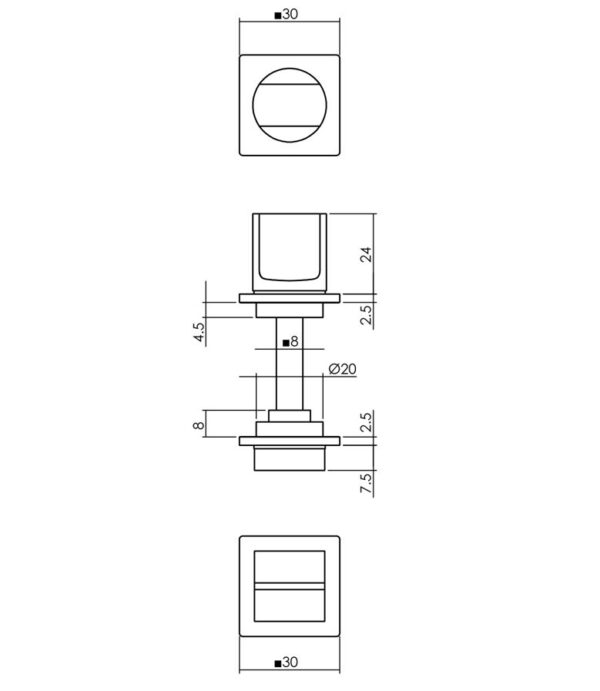 Deze toilet-/badkamersluiting is vervaardigd uit geborsteld roestvast staal. Omdat de geborstelde structuur behouden blijft heeft deze sluiting een matte uitstraling. De minimalistische vierkante rozetten hebben een afmeting van 30 x 30 mm en zijn 2,5 mm dik. Tevens zijn de rozetten zelfklevend, waardoor er geen bevestigingsmateriaal nodig is. Dit product wordt per set geleverd.