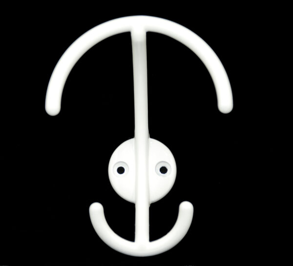 Dit is een metalen kapstokhaak die wit is gespoten.
