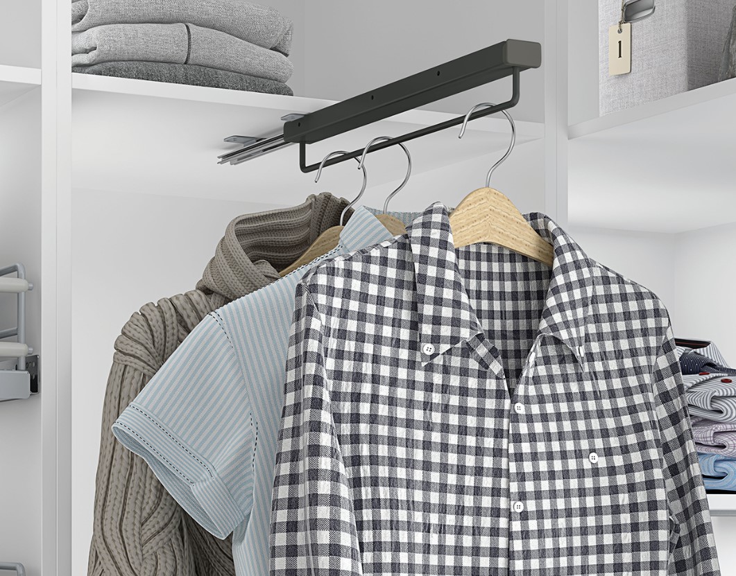 Deze luxe uittrekbare gardarobehouder heeft een kogelgelagerde geleider voor een soepele loop. De gardarobehouder is afgewerkt in antraciet en is enkel uittrekbaar. Het heeft een lengte van 360mm en een maximale belastbaarheid van 15kg. De garderobehouder kun je onder de plank opschroeven.
