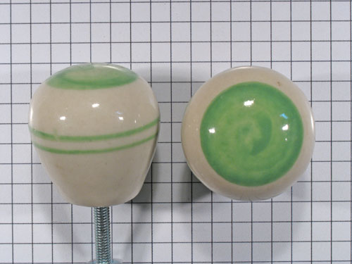 Knop porselein, 30 mm, groen . Foto is genomen op ruitjes van 5 x 5 mm.