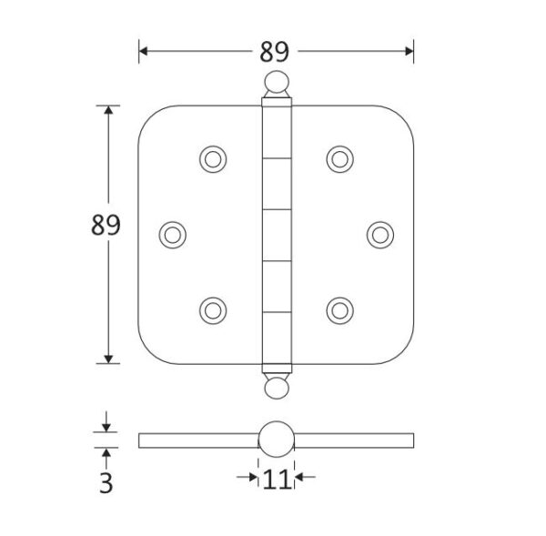 Kogellagerscharnier 89×89 ronde hoek bol messing ongelakt