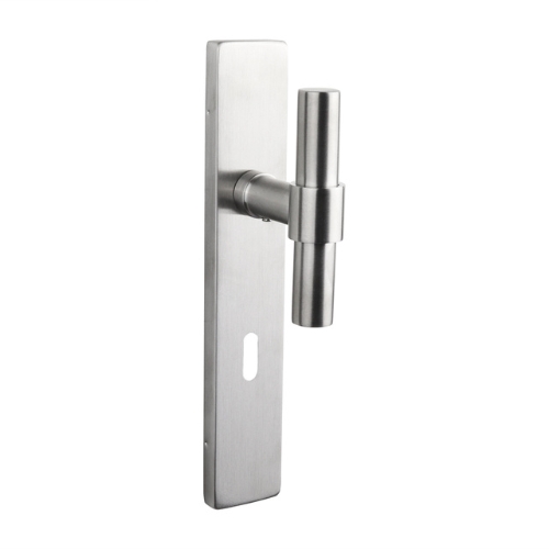 Deurklink Pesaro op rechthoekig schild is vervaardigd uit roestvast staal en is naderhand geborsteld. Deze deurklink wordt geleverd met schild en heeft een stalen onderconstructie. De h.o.h. maat van de deurklink tot het sleutelgat is 72 mm. Geschikt voor een deurdikte van 38 – 42 mm