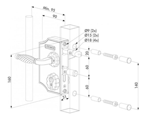 sierpoortslot met aluminium behuizing en roestvrijstalen binnenwerk. Dankzij de regelbaarheid van beide pennen, kan u elke poort haarfijn afregelen om een soepele vergrendeling te garanderen. Een massieve, roestvrijstalen nachtpen met 23 mm dieptevergrendeling garandeert een veilige sluiting. Standaard voorzien met een set deurklinken van zamak.