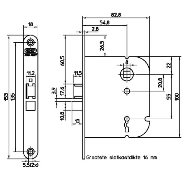 Het Nemef binnendeurslot 55mm standaard is een eenvoudig slot voor je binnendeur met dag- en nachtschoot. De dagschoot is omkeerbaar voor links- en rechtsdraaiende deuren. De voorplaat is 153mm lang en de slotkast is 83mm bij 100mm. De voorplaat van het slot is wit gelakt.
