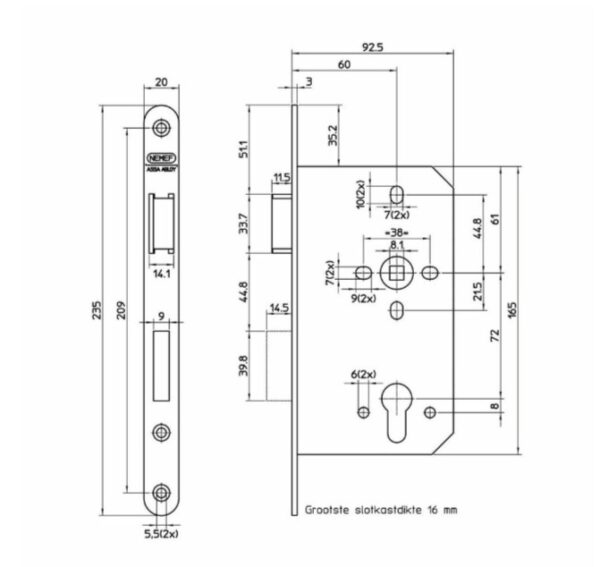 Afmeting slotkast (HxBxD): 165x93x16 mm
