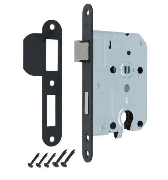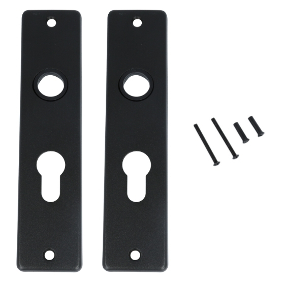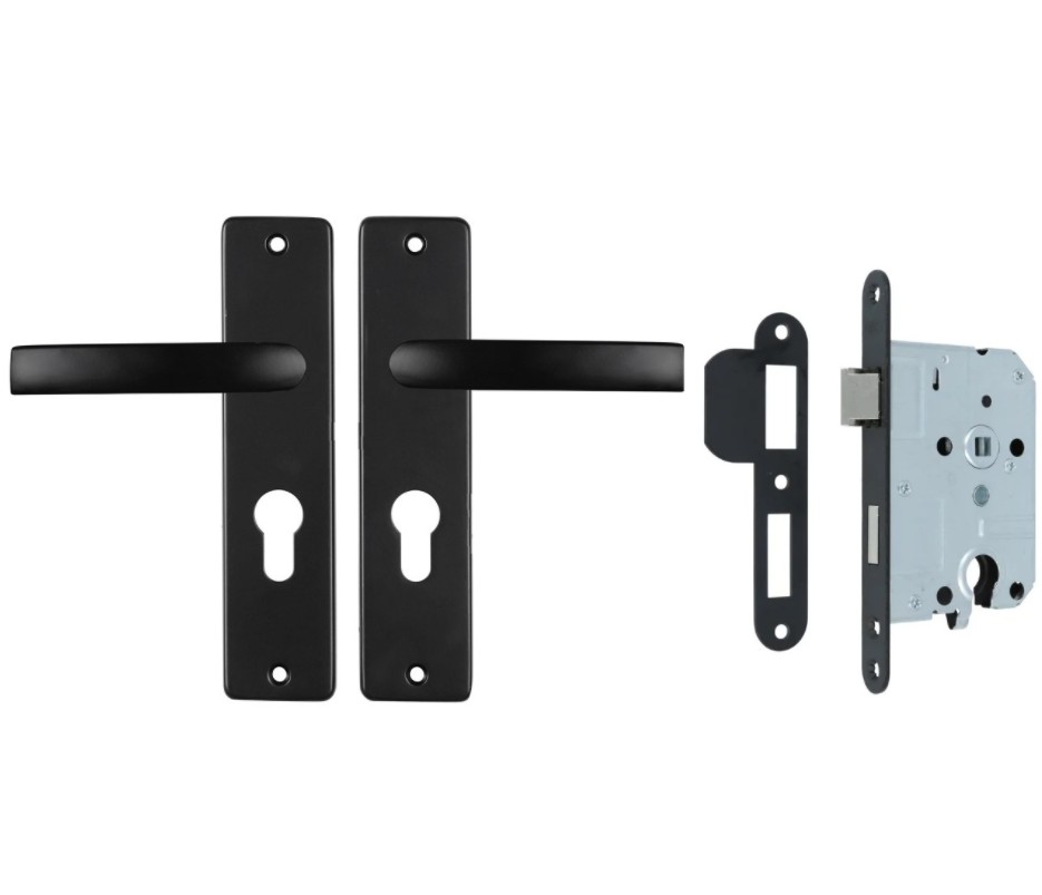 Het materiaal van de schilden en deurklink is aluminium. De schilden zijn uitgevoerd met een cilindergat op 55 mm. Bij deze set worden 2x patentbout en 2x huls meegeleverd. De cilinder dag en nachtslot PC55 met zwarte voorplaat is afgewerkt met een zwarte coating. Dit slot is afsluitbaar met een een profielcilindergat maat op 55 mm en wordt geleverd met een zwarte sluitplaat en schroeven. De doornmaat van dit slot is 50mm. De dagschoot van dit slot is omwisselbaar; dat wil zeggen dat deze voor zowel een linksdraaiende deur als een rechtsdraaiende deur geschikt is. De schoot is van het materiaal messing. Geschikt voor deuren tot een maximale deurdikte van 40 mm.