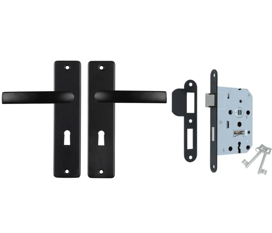 Het materiaal van de schilden en deurklink is aluminium. De schilden zijn uitgevoerd met een sleutelgat op 56 mm. Bij deze set worden 2x patentbout en 2x huls meegeleverd. De klavier dag en nachtslot SL56 met zwarte voorplaat is afgewerkt met een zwarte coating. Dit slot is afsluitbaar met een sleutelgat maat op 56 mm en wordt geleverd met 2 klavier sleutels, een zwarte sluitplaat en schroeven. De doornmaat van dit slot is 50mm. De dagschoot van dit slot is omwisselbaar; dat wil zeggen dat deze voor zowel een linksdraaiende deur als een rechtsdraaiende deur geschikt is. De schoot is van het materiaal messing. Geschikt voor deuren tot een maximale deurdikte van 40 mm.
