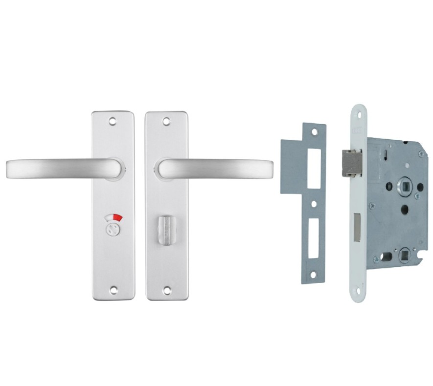 Het materiaal van de schilden en deurklink is aluminium. De schilden zijn uitgevoerd met een cilindergat op 55 mm. Bij deze set worden 2x patentbout en 2x huls meegeleverd. De wc-badkamerslot WC63/8 met witte voorplaat is afgewerkt met een witte coating. Dit slot wordt geleverd in toilet-/badkamer uitvoering op 63 mm. Het wordt geleverd met een sluitplaat. De doornmaat van dit slot is 50mm. De dagschoot van dit slot is omwisselbaar; dat wil zeggen dat deze voor zowel een linksdraaiende deur als een rechtsdraaiende deur geschikt is. De schoot is van het materiaal messing. Geschikt voor deuren tot een maximale deurdikte van 40 mm.