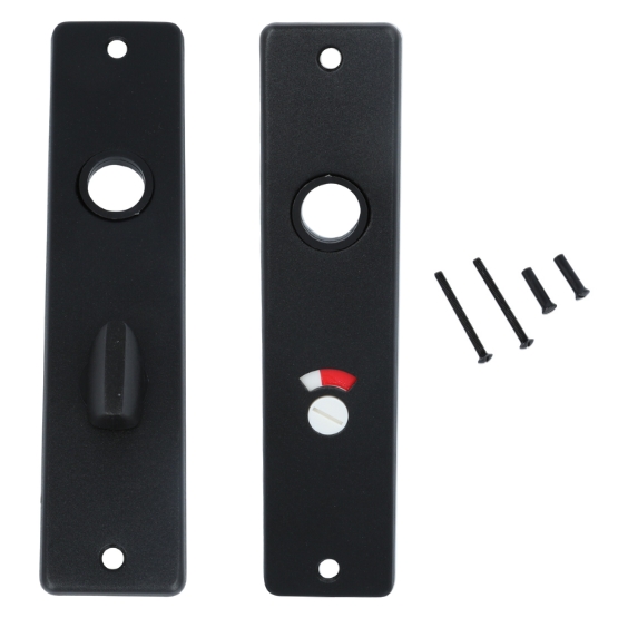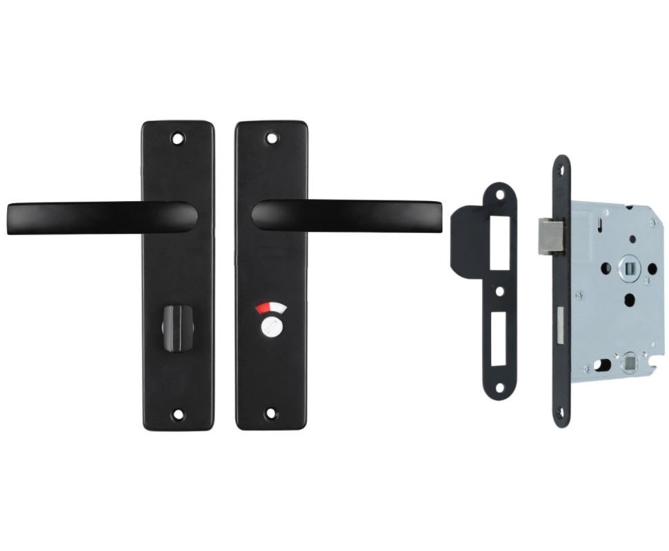 Het materiaal van de schilden en deurklink is aluminium. De h.o.h. maat van de deurklink tot de WC-sluiting is 63 mm. De stift maat is vierkant 8 mm. Bij deze set worden 2x patentbout en 2x huls meegeleverd. De wc-badkamerslot WC63/8 met zwarte voorplaat is afgewerkt met een zwarte coating. Dit slot wordt geleverd in toilet-/badkamer uitvoering op 63 mm. Het wordt geleverd met een zwarte sluitplaat en schroeven. De doornmaat van dit slot is 50mm. De dagschoot van dit slot is omwisselbaar; dat wil zeggen dat deze voor zowel een linksdraaiende deur als een rechtsdraaiende deur geschikt is. De schoot is van het materiaal messing. Geschikt voor deuren tot een maximale deurdikte van 40 mm.