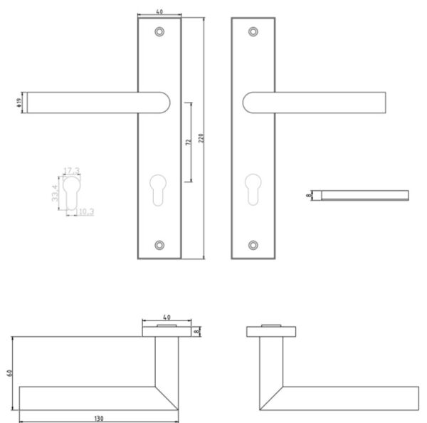 Rvs voorplaat van het slot is 235 x 22 mm.