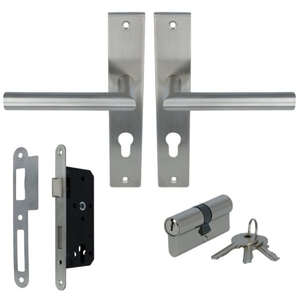 Deze set bestaat uit een rvs deurklink op schild, veiligheidsslot inclusief sleutels, sluitplaat en een cilinder. Compleet met bevestigingsmateriaal.