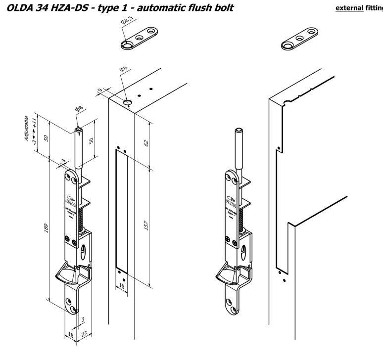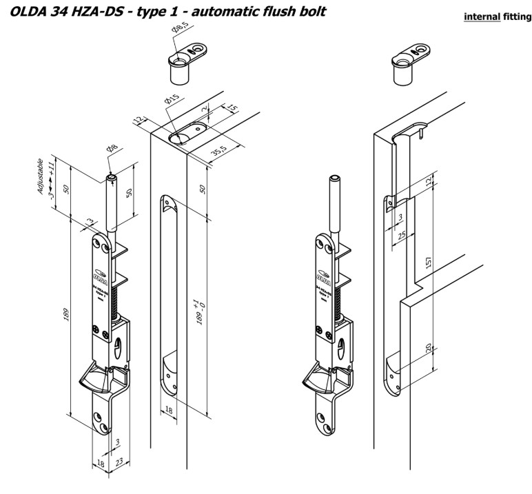 Olda automatische kantschuif type 34 voor stalen/aluminium/houten deuren schoot Ø8mm lengte 50 mm type 1 staal verzinkt
