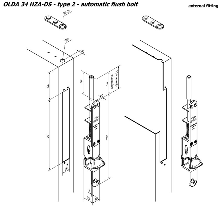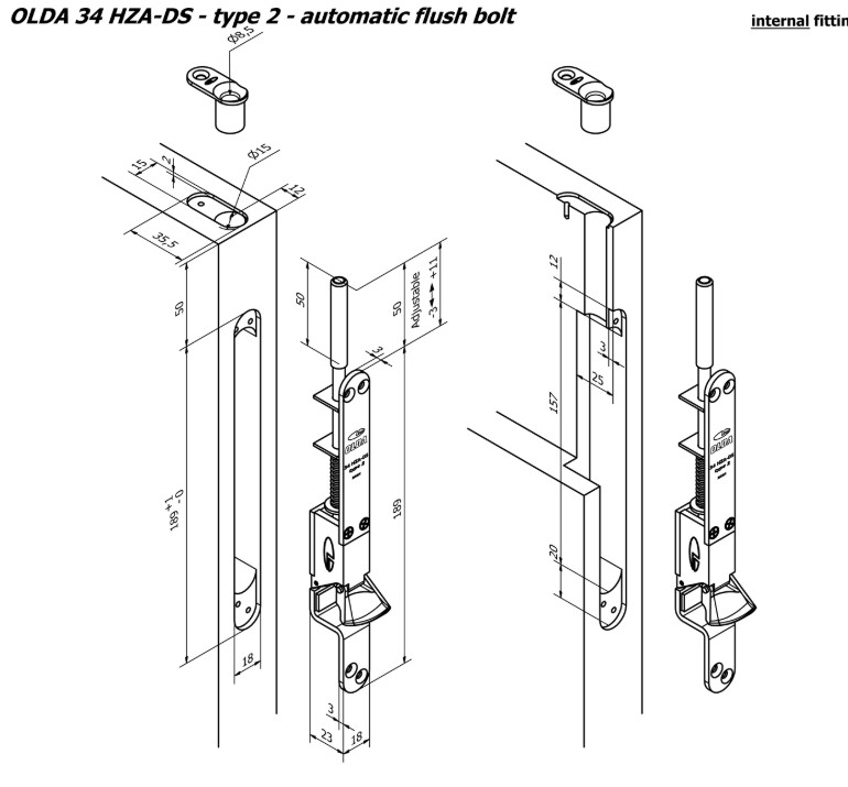 Olda automatische kantschuif type 34 voor stalen/aluminium/houten deuren schoot Ø8mm lengte 50 mm type 2 staal verzinkt
