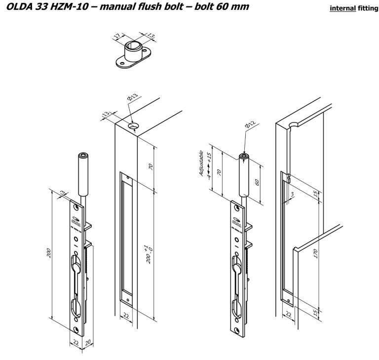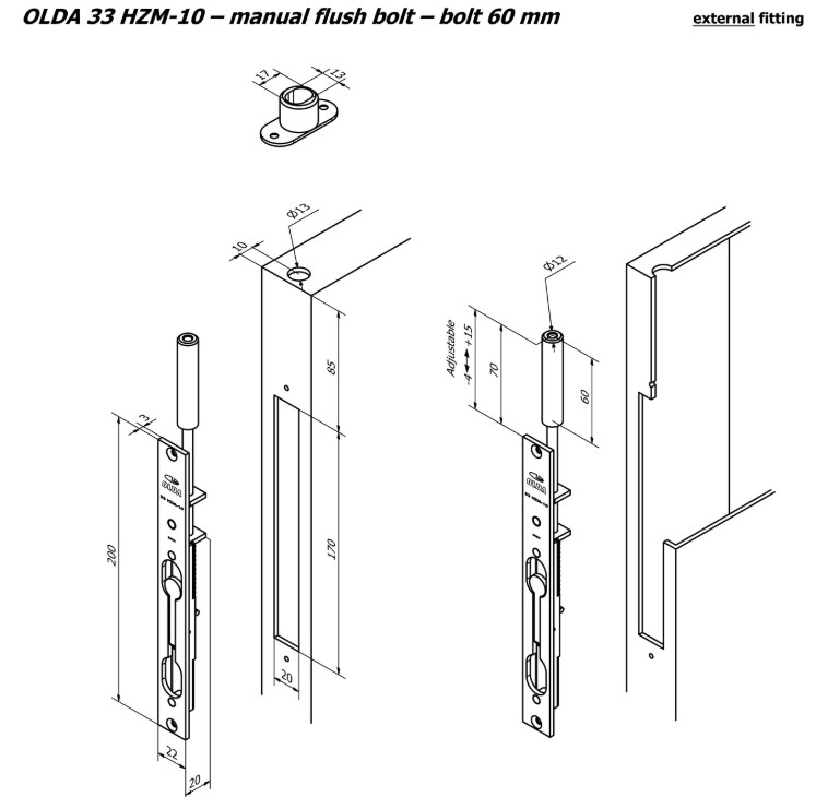 Deze manuele kantschuif is gemaakt van elektrolytisch verzinkt staal en voor stalen en aluminium deuren verkrijgbaar met de doornmaten 10, 20 en 35 mm. Hij wordt geleverd als complete set in een verpakking en bevat al het montagemateriaal, de sluitplaat LT 12 (17×13) en bij twee modellen een schootgeleider.