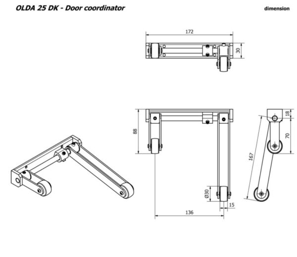 De sluitvolgorderegelaar is gemaakt van staal en werkt met twee armen waarvan de lange arm de actieve deur tegenhoudt totdat de passieve deur gesloten is. De regelaar is omkeerbaar, zodat hij zowel bij linker als rechter passieve deuren kan worden gebruikt.